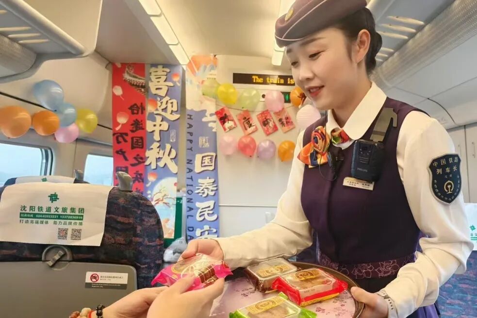 热闹的活动让车厢变成欢乐的海洋,列车员将月饼等精美伴手礼送给旅客,为他们送上节日的祝福。