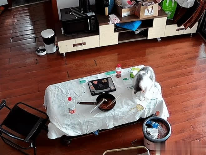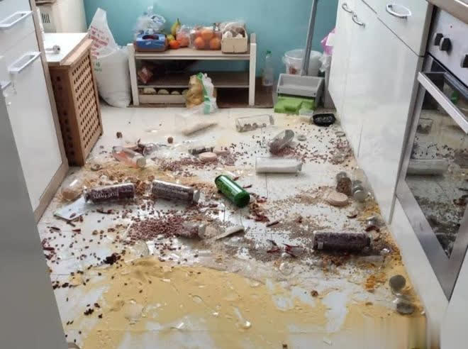 还有猫咪潜入厨房,将调料瓶全部推倒,各种调料洒了一地,让人哭笑不得……