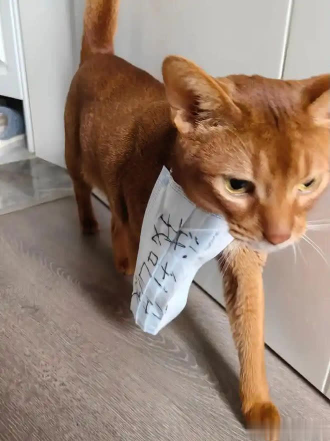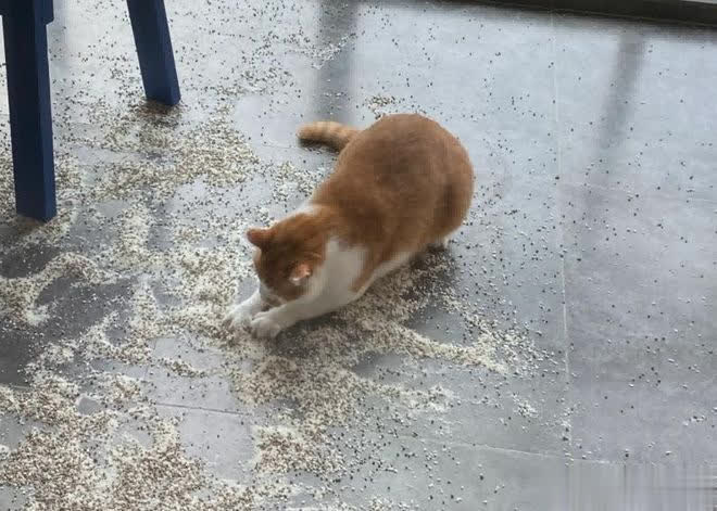 某只橘猫在客厅悄无声息地“作案”,等主人发现时,它已经将两袋猫砂拆散,在砂堆中玩得不亦乐乎;