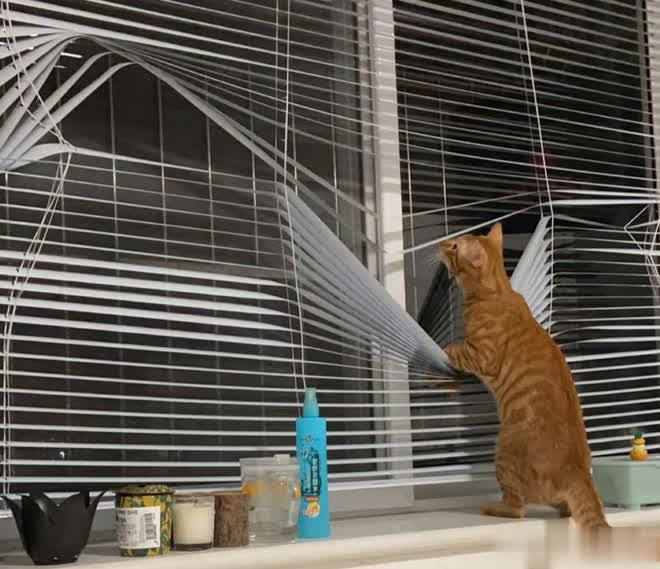 更令人无奈的是家居设施的损坏:新安装的百叶窗被猫咪当作攀爬架,几下就被折腾得变形失效;