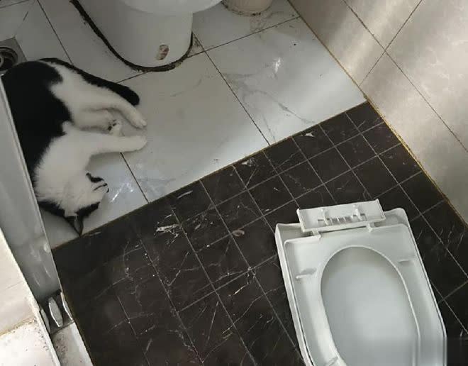 一只奶牛猫在拆下马桶盖后被主人发现,立即躺倒在卫生间地面上一动不动;当主人开始训斥时,它又迅速跳上床闭眼装睡,却不忘偷偷斜眼观察主人的反应。