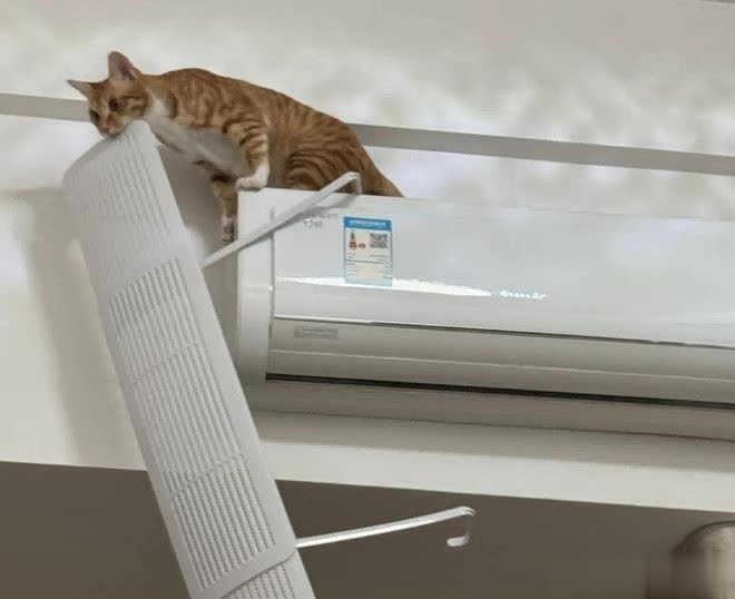 一只橘猫跳上空调挂机,几分钟内就将外壳拆解下来;